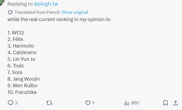 一位英国球迷心目中的现役前十,王楚钦第一,小勒第二,张本第三,温瑞博第九